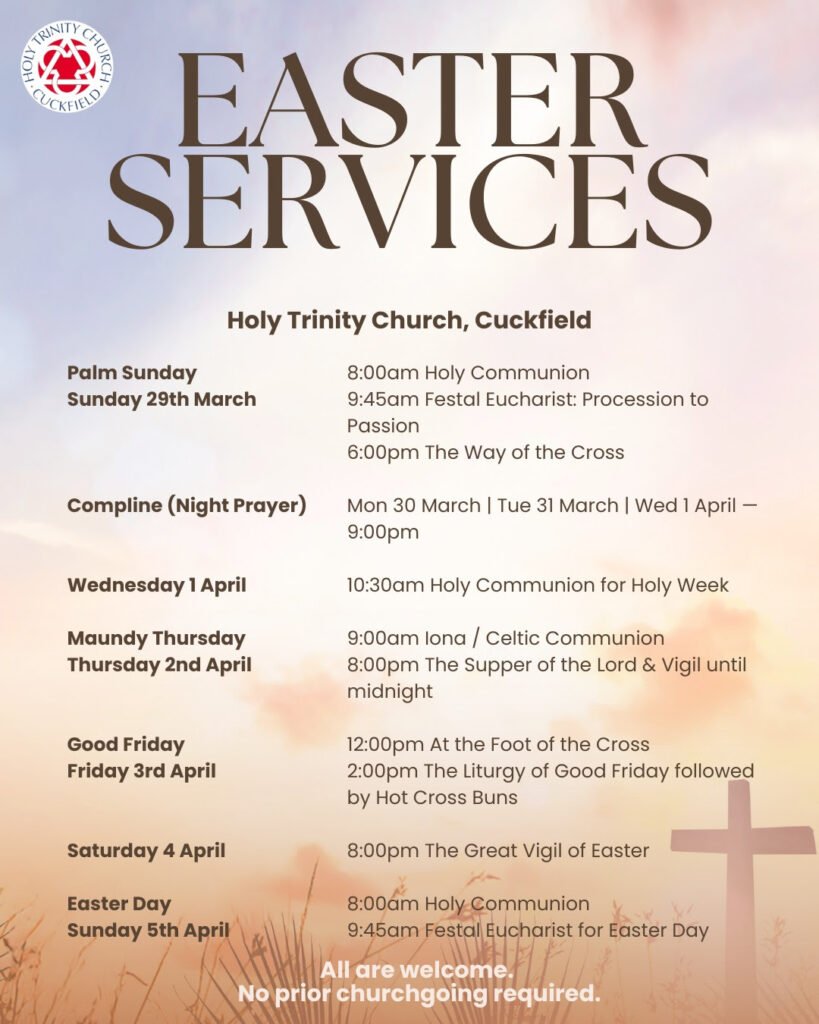You can find times and summary details of all our services throughout Holy Week on the poster below, starting with Palm Sunday on 29th March, and through to Easter Day on 5th April.